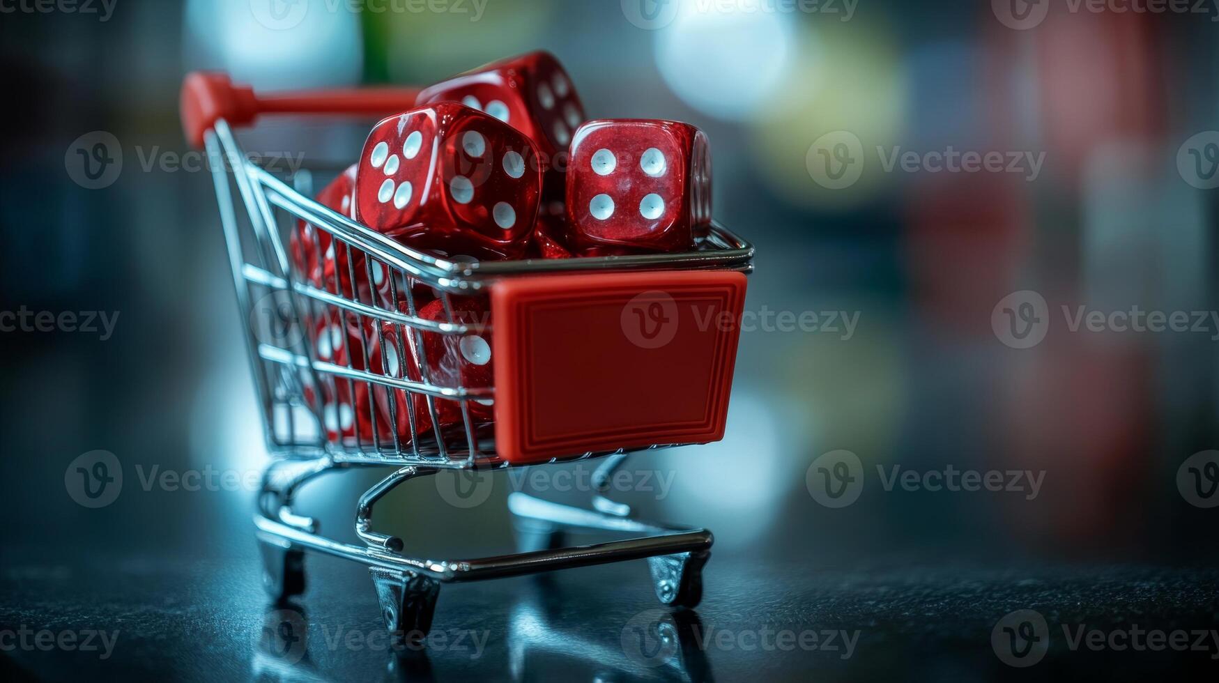 Red shopping cart filled with dice in a playful setting during the evening hours Pro Photo