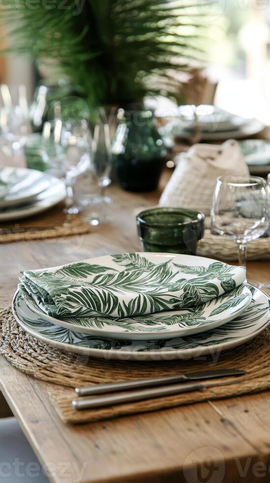 Elegant Table Setting with Botanical Leaf Pattern Pro Photo
