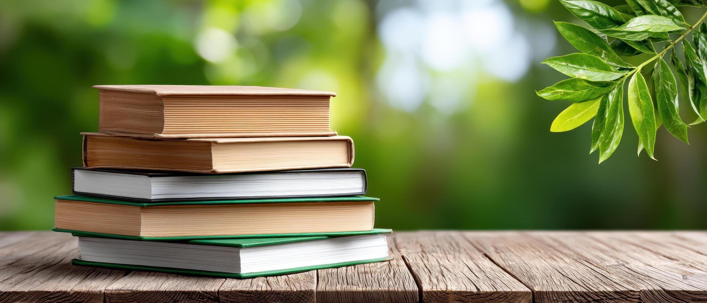 Books Stacked on Rustic Wooden Surface with Green Background and Copyspace for Creative Use Free Photo