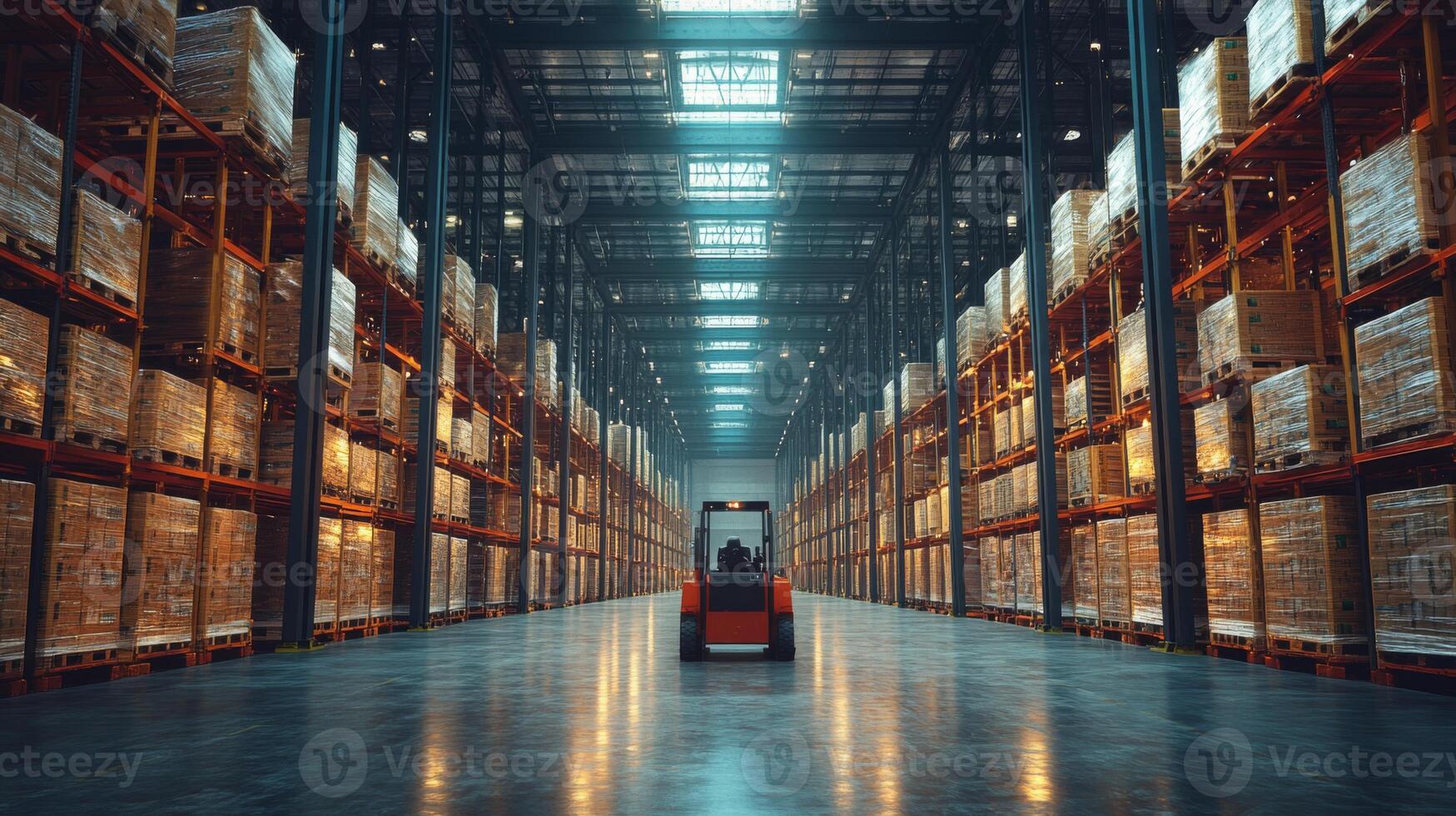 A forklift is navigating through a spacious warehouse filled with neatly stacked pallets, highlighting the systematic arrangement of inventory and efficient logistics. Pro Photo