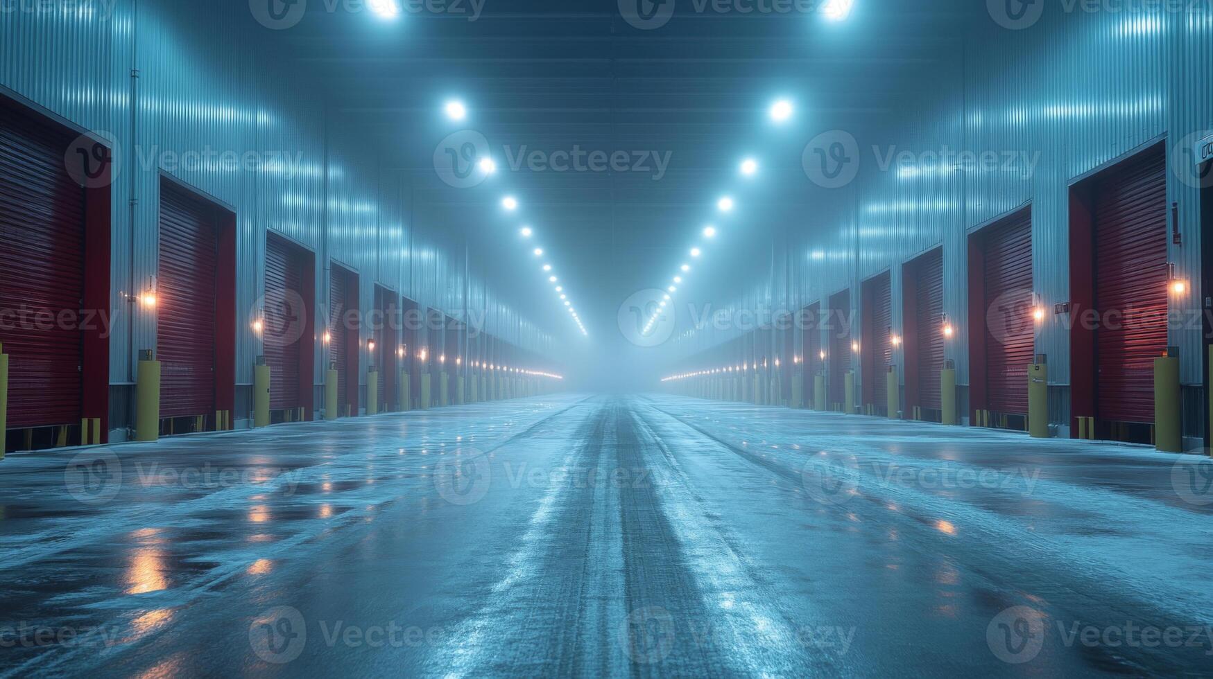 A state of the art cold storage facility features rows of well lit loading bays designed for optimal temperature control, ensuring safe inventory management of perishable items. Pro Photo