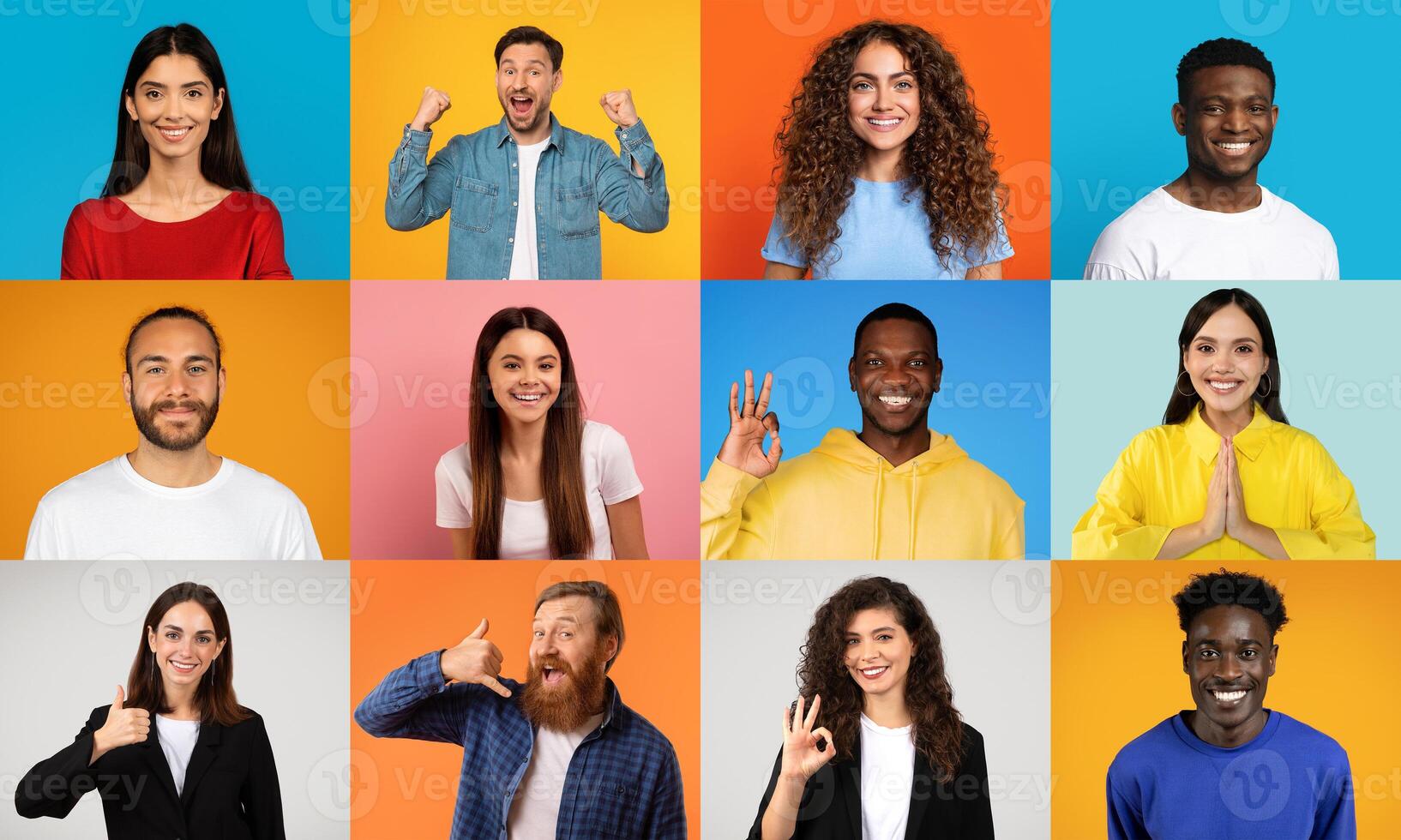 A lively collection features diverse men and women displaying a range of joyful expressions. Set against bright backgrounds, they represent unity in their interactions. Pro Photo