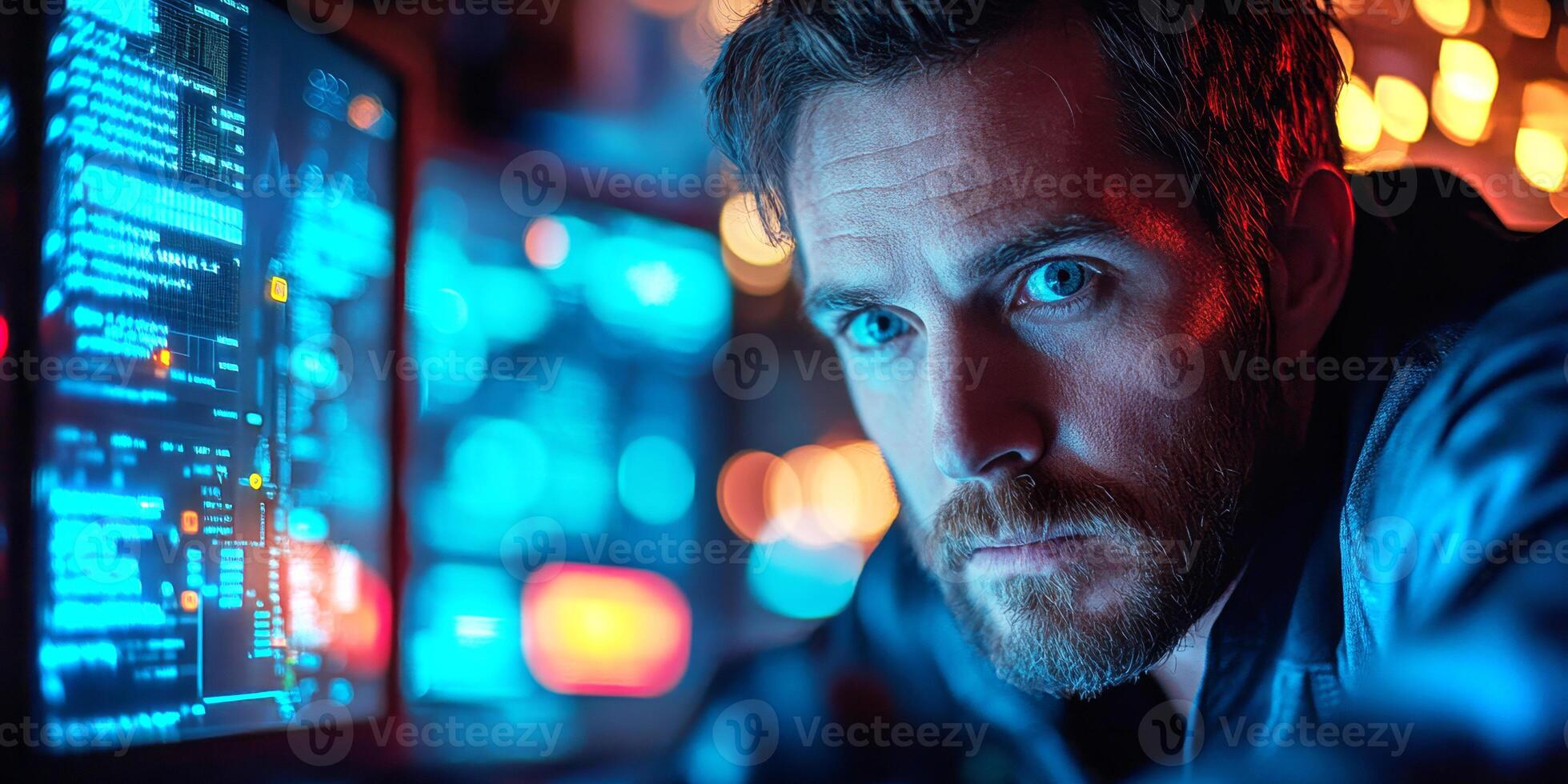 A cybersecurity expert examines data and monitors potential risks on multiple screens while working in a dimly lit room filled with illuminated technology. Pro Photo