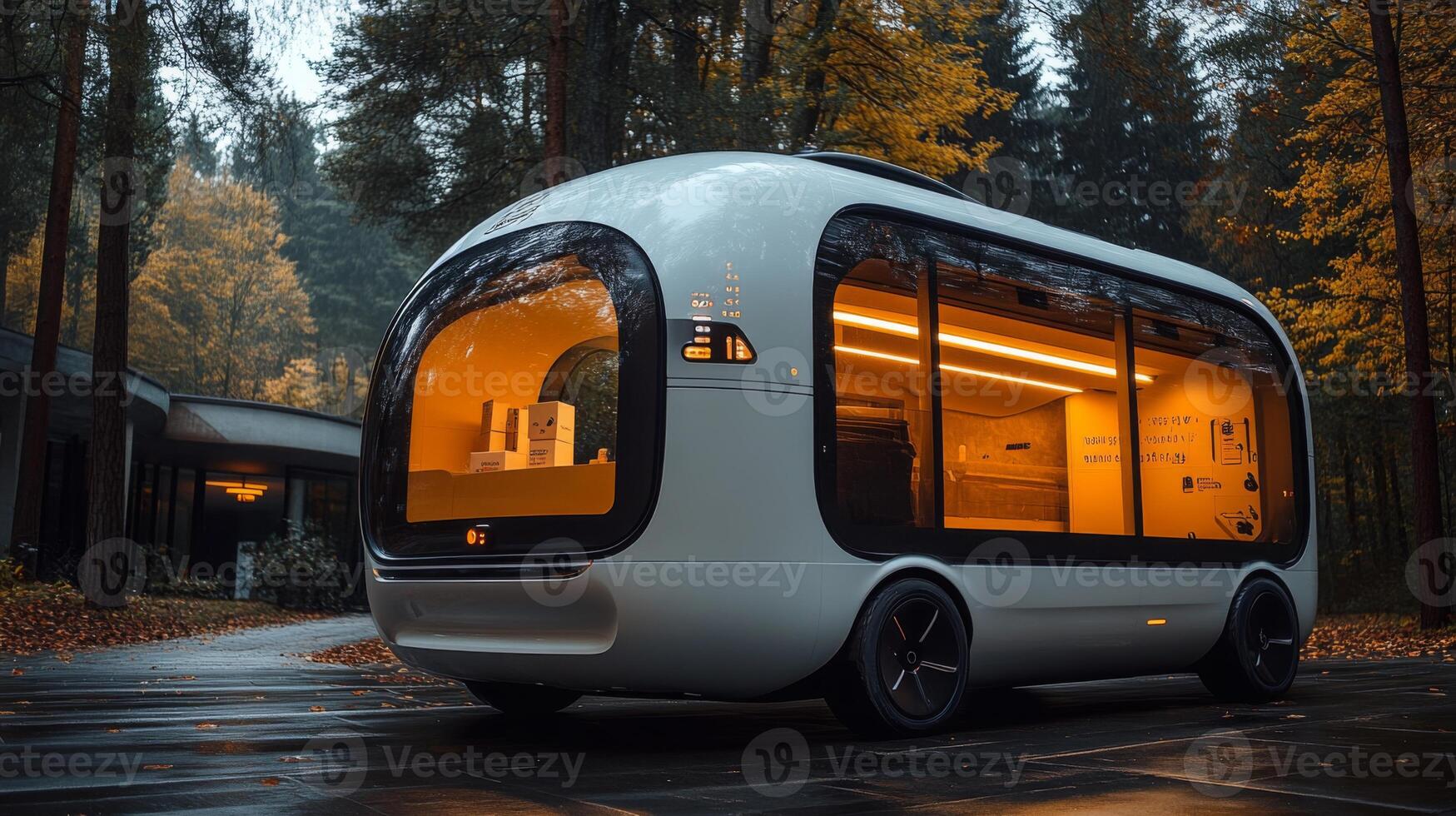 An autonomous delivery vehicle operates in a forested urban environment, showcasing advanced technology. The sleek design is illuminated, highlighting the innovative features and functionality. Pro Photo