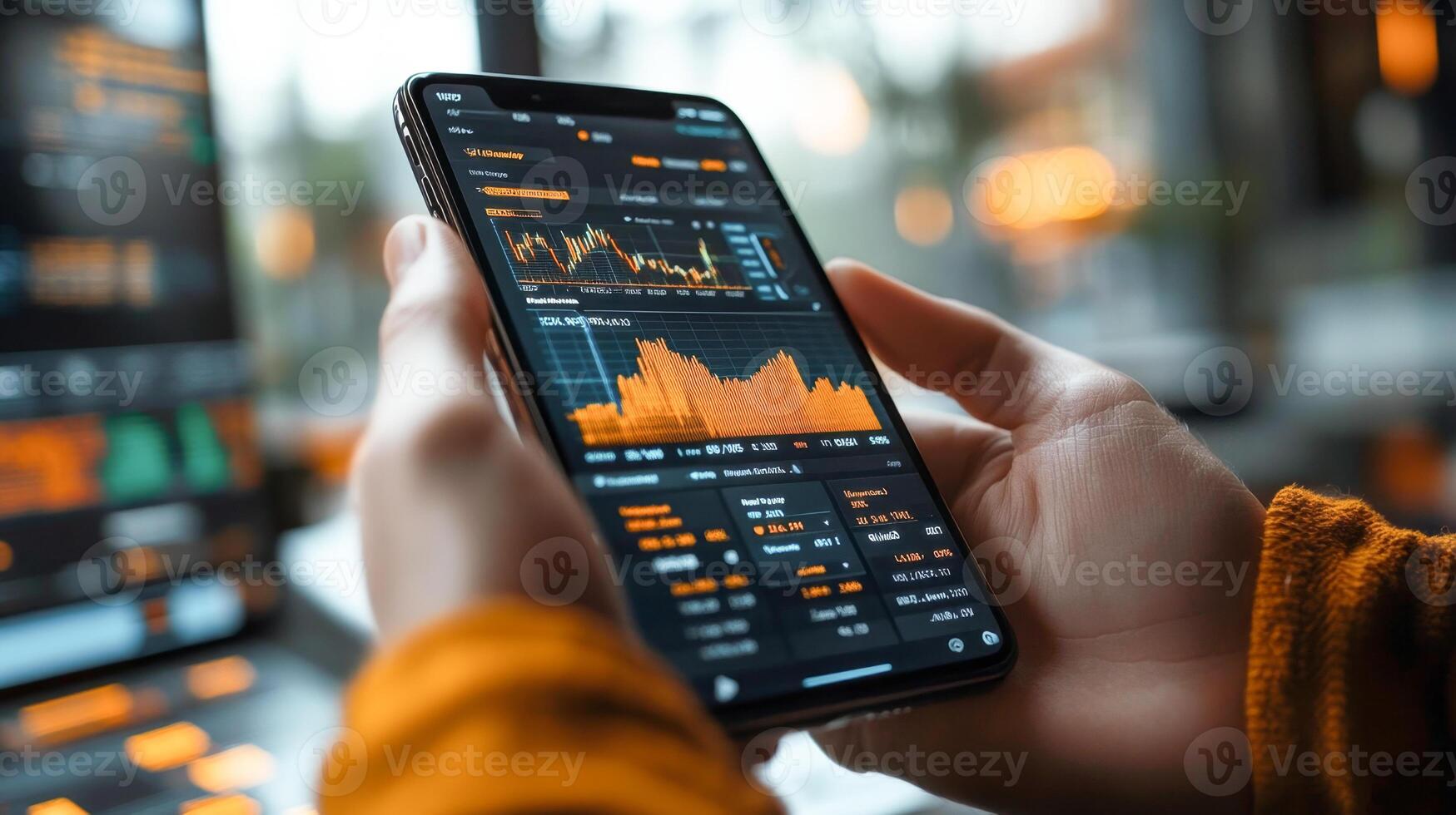 A person holds a smartphone displaying banking transaction details in a cozy cafe setting. The screen shows graphs and financial data, indicating a verification process occurring during a busy day. Pro Photo