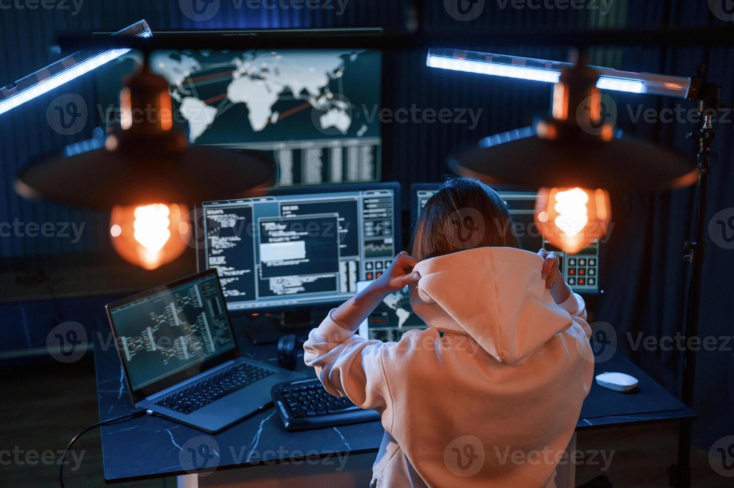 View, from behind. Young professional female hacker, is indoors by computer with lot of information on displays Pro Photo