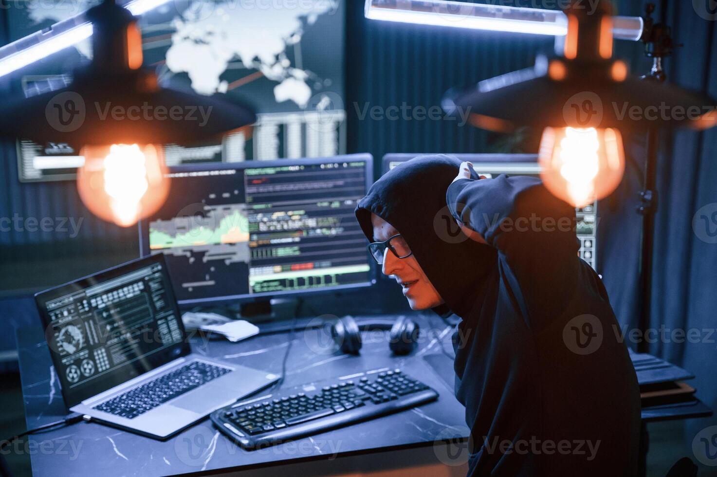 Got caught. With hands up. Male professional hacker is sitting by computer, conception of virus Pro Photo