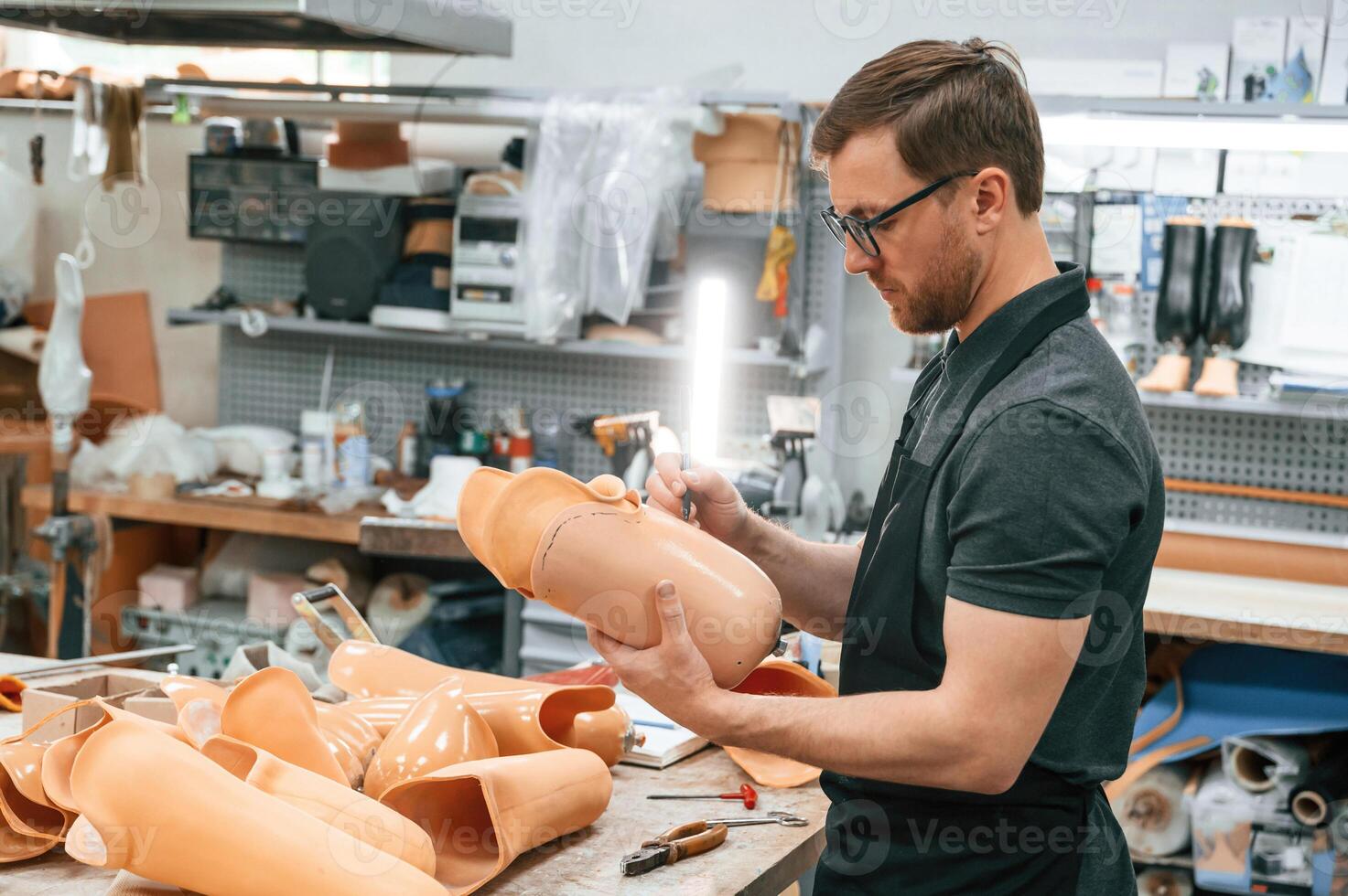 Using marker to draw the line. Technician working with prosthesis in modern laboratory Pro Photo