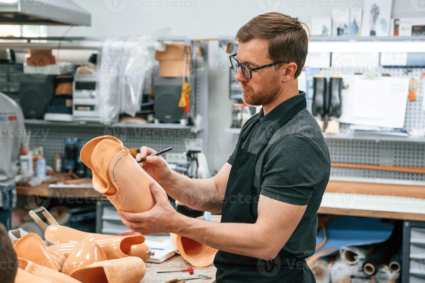 Using ,marker ,to draw the line. Technician working with prosthesis in modern laboratory Pro Photo