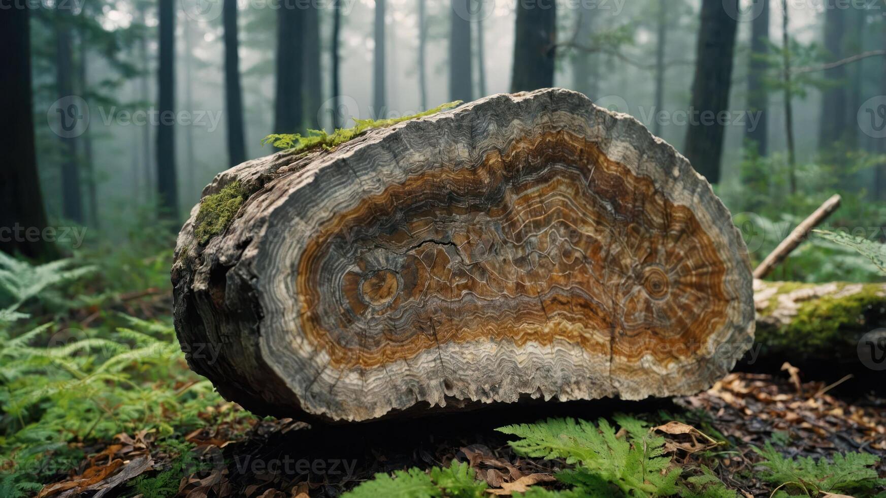A cross-section of a tree trunk showcasing intricate patterns in a misty forest setting. Pro Photo
