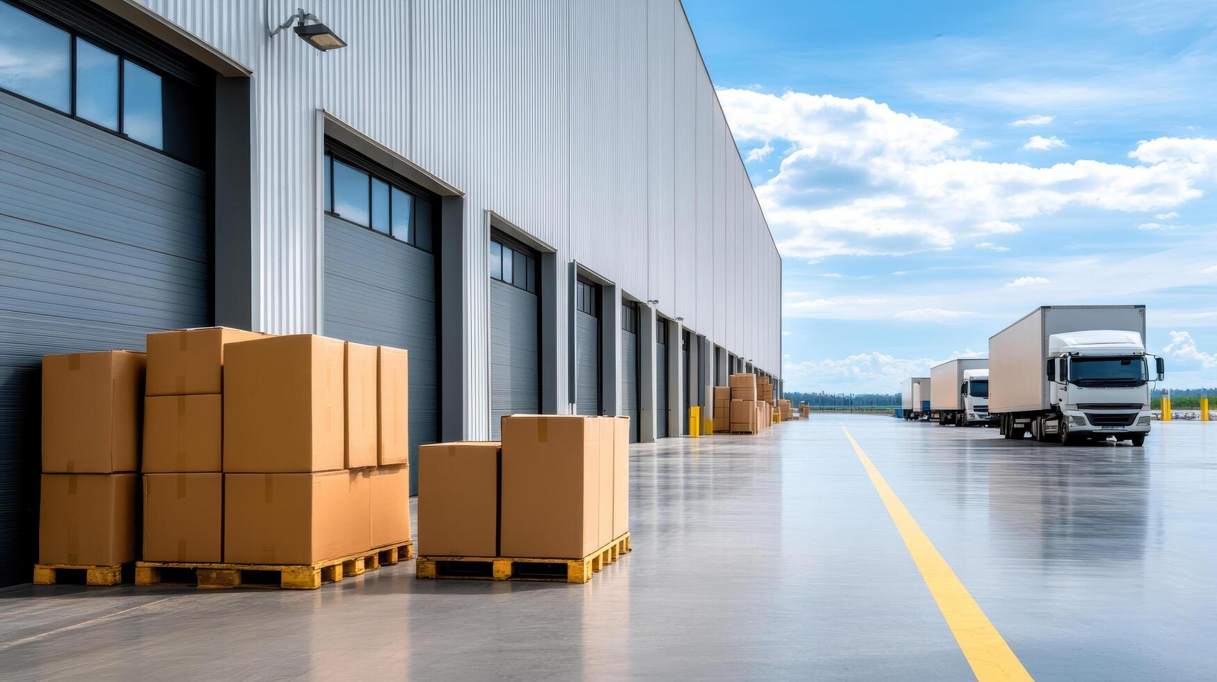 Large loading dock with trucks and stacked boxes ready for shipment Free Photo