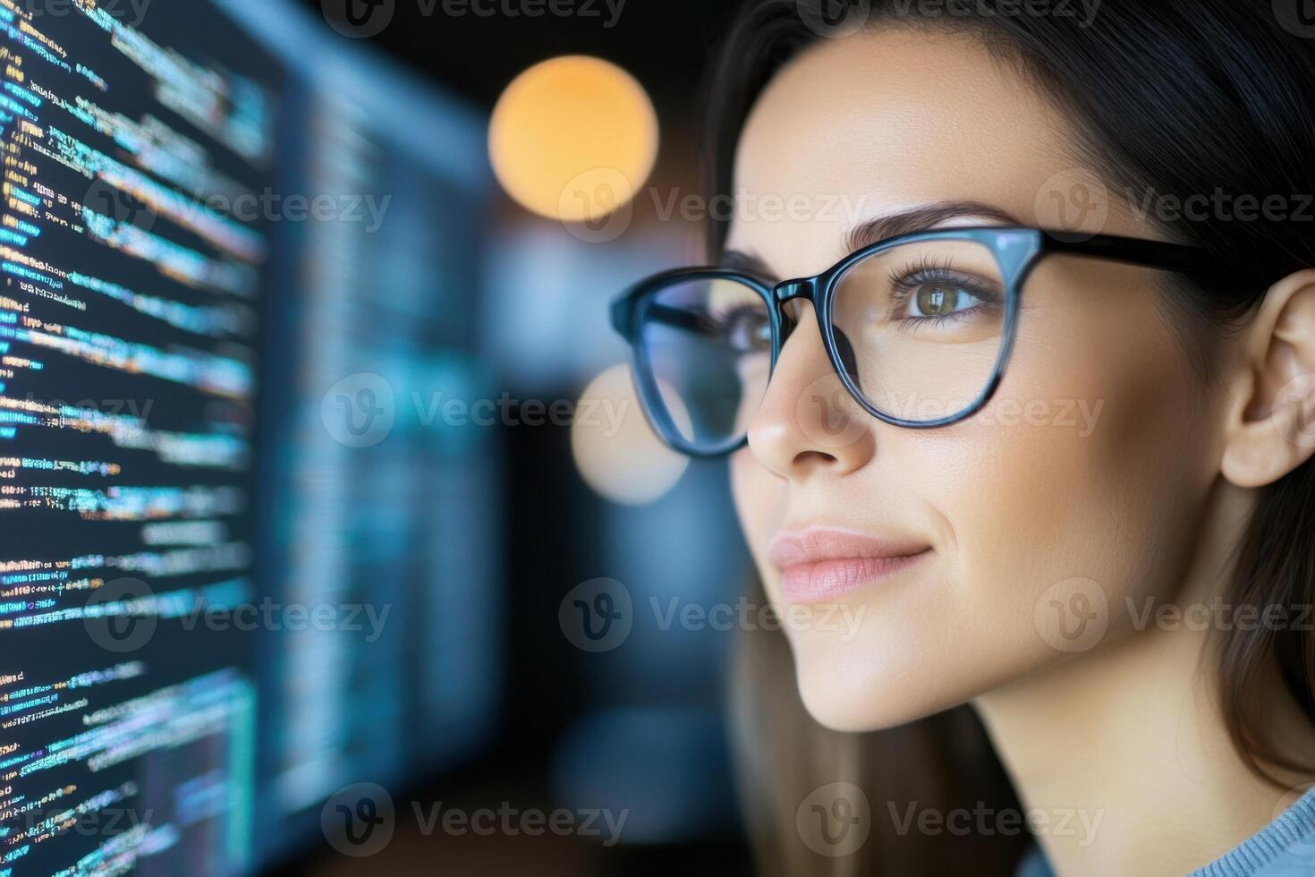 Software engineer working on cybersecurity, analyzing source code on computer screen Pro Photo