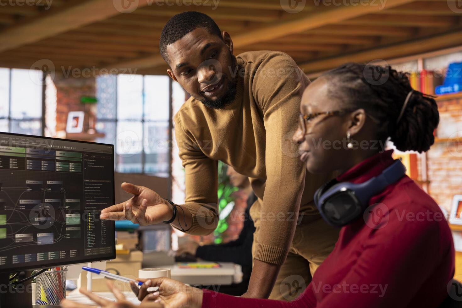 Team of technicians brainstorming in startup office, coding advanced AI algorithm and machine learning models. African american colleagues talk in artificial intelligence Silicon Valley workplace Pro Photo