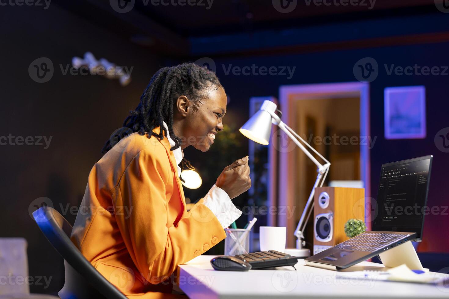 Joyous programmer at desk typing code on laptop, delighted after successfully developing software program. Thrilled african american woman at home excited after implementing new features Pro Photo
