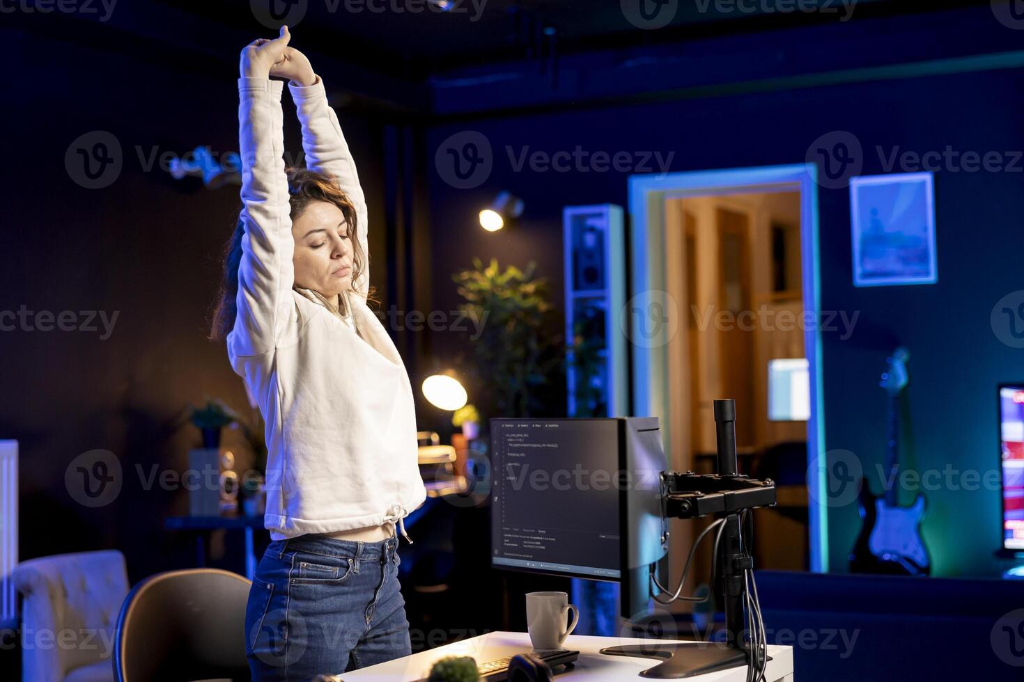 Computer scientist doing software quality assurance, stretching after reading source code, feeling tired. IT staff member relaxing muscles after inspecting coding to fix potential issues all day Pro Photo