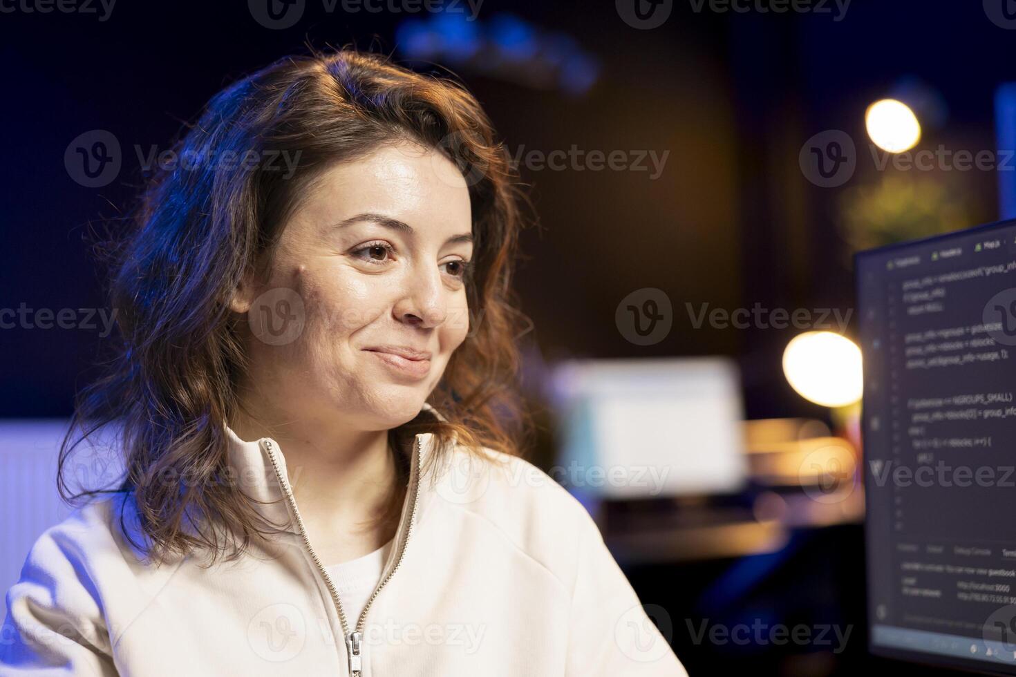 Jolly cybersecurity specialist happy after finding security vulnerabilities and preventing malware infections. Upbeat admin content with installed fortified code preventing cyberattacks Pro Photo