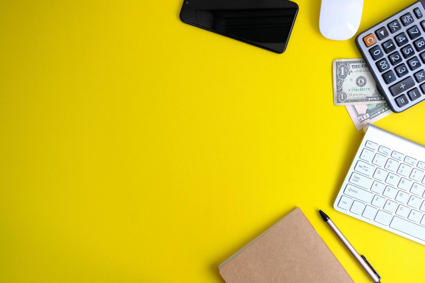 Blank notebook with pen is placed on an office desk table with computer tools and a range of materials. finance and banking background, flat lay, top view photo