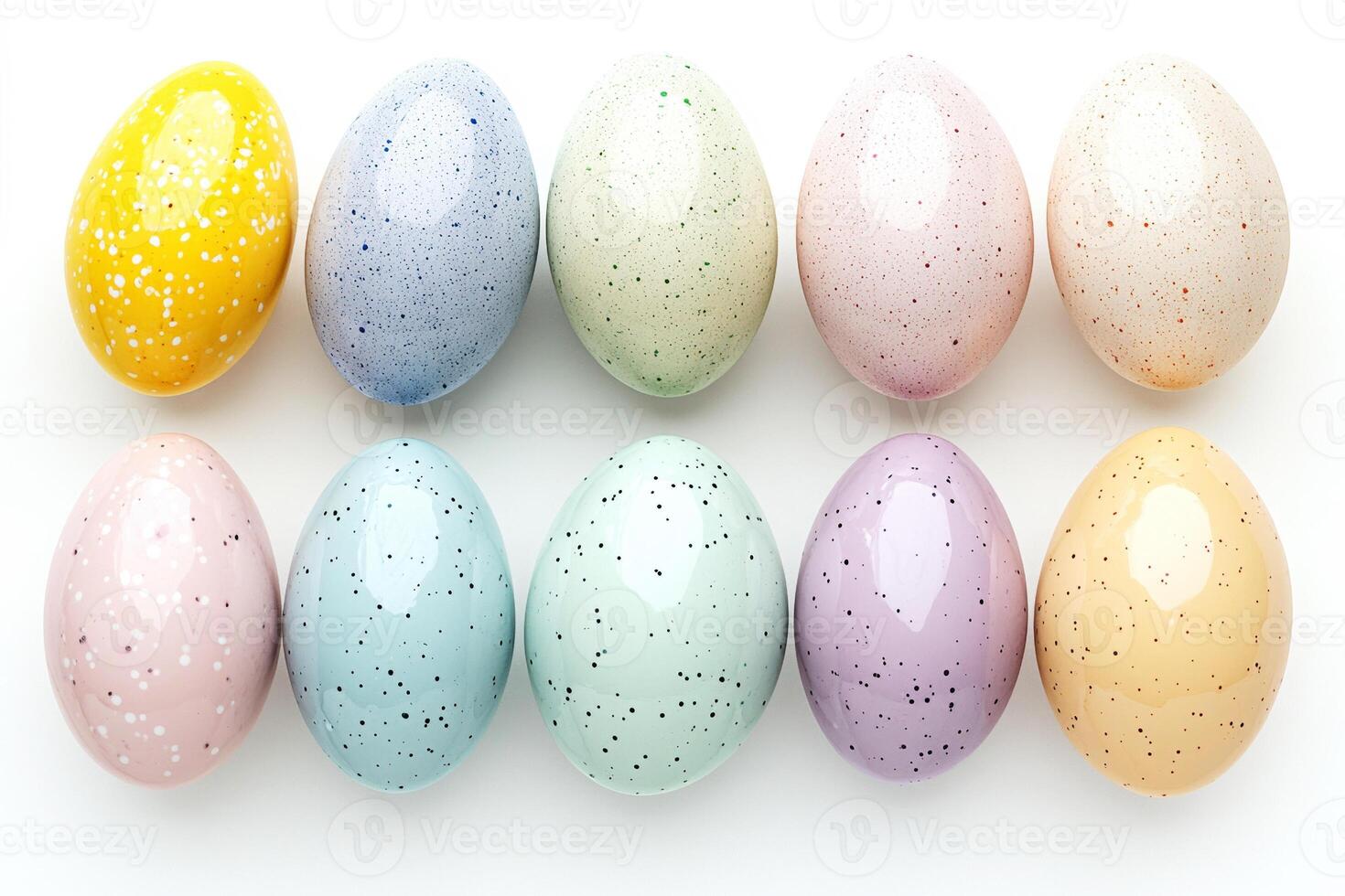 Colorful candy-coated eggs arranged in a neat row on a surface Pro Photo
