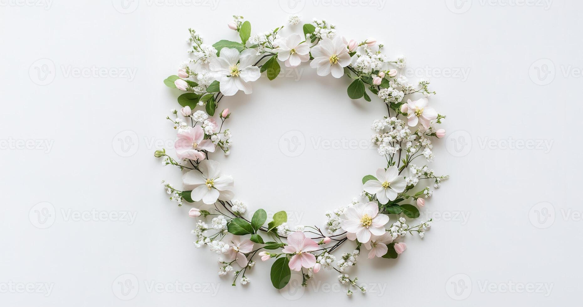 Delicate spring flowers and leaves arranged in a perfect circle pristine white backdrop, creating a minimalist and elegant wreath design Pro Photo