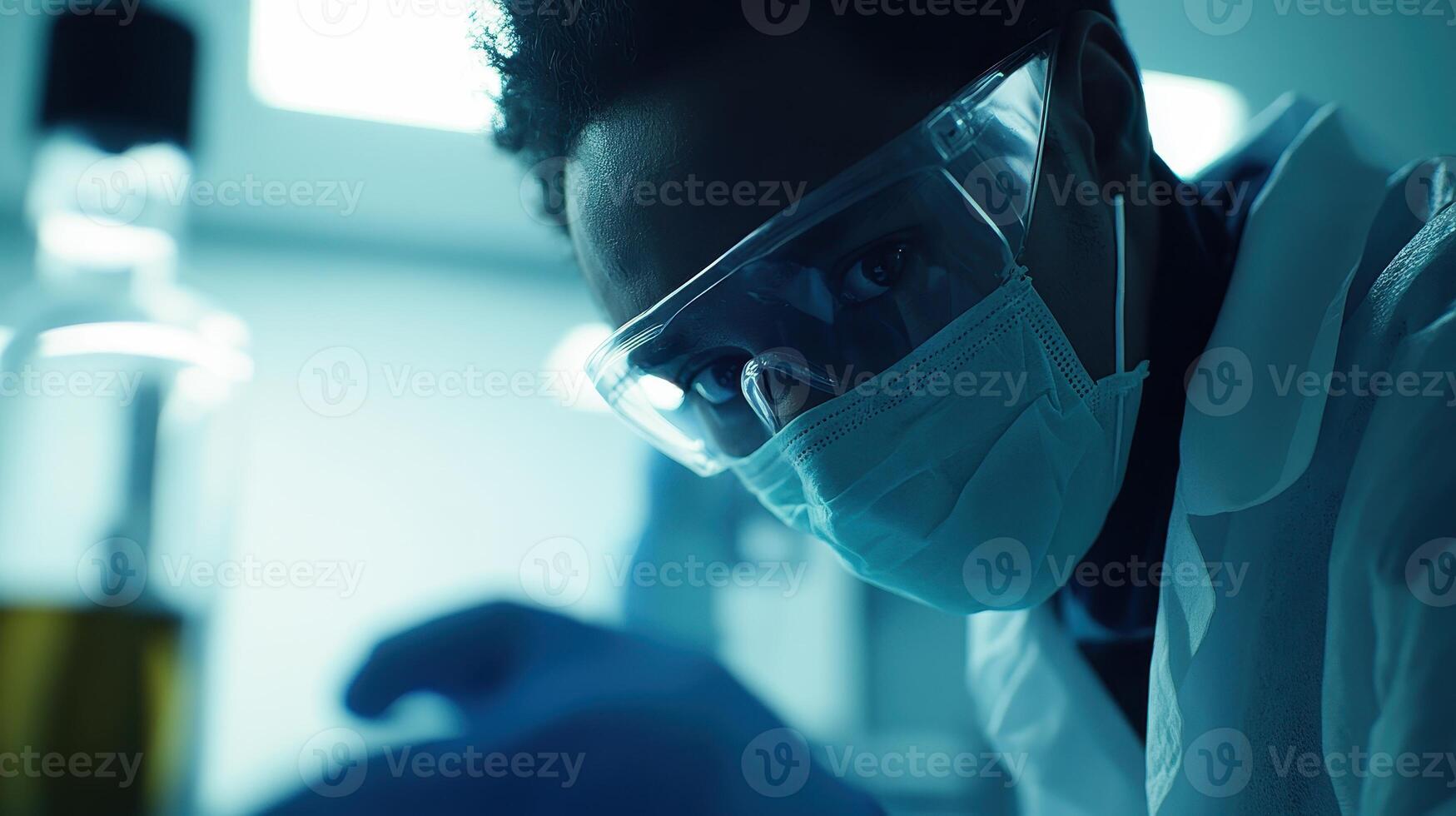 A scientist in a lab, wearing protective gear and examining a sample under a microscope Pro Photo