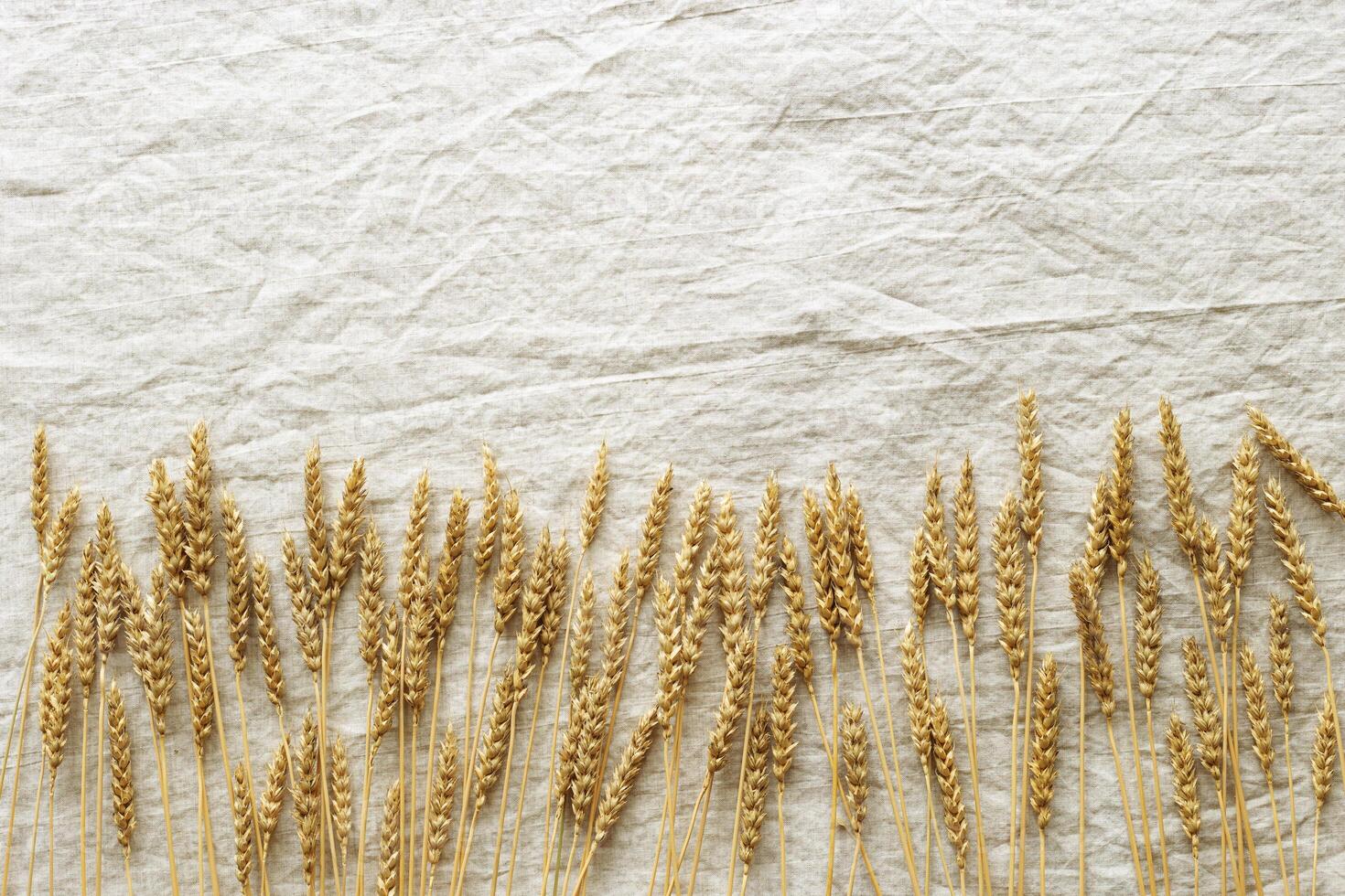Top view dried ears of cereal crops, durum wheat grain crop on beige color textile background with copy space. Flat lay with ears of wheat on table, minimal still life, harvest concept Pro Photo