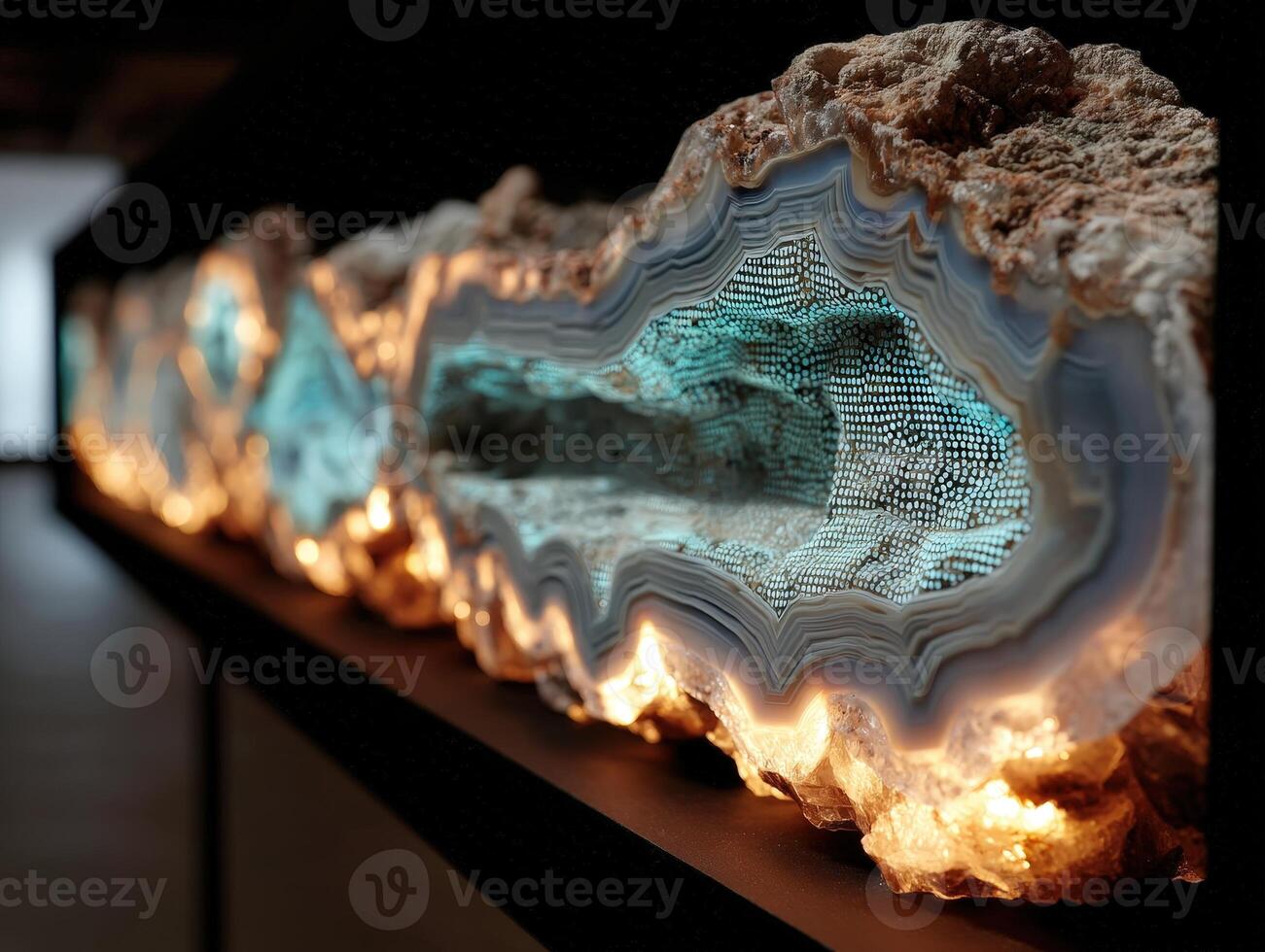 Close-up of illuminated geode section showing intricate blue and white layers with crystalline structure, mounted on display. The focus is on texture and detail of the stone Pro Photo