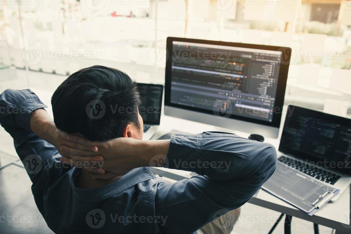 Asian programmers man are relaxing and looking at the code on the computer screen in the office. Pro Photo