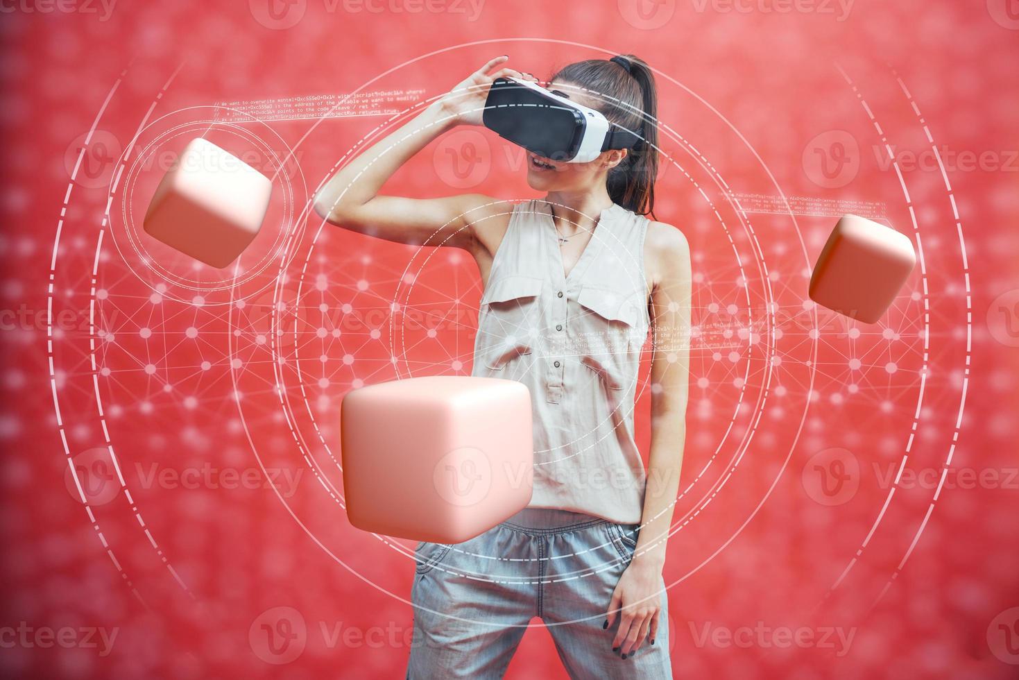 Visual reality concept. Young man using Visual reality or VR headset and interacting with object. Pro Photo