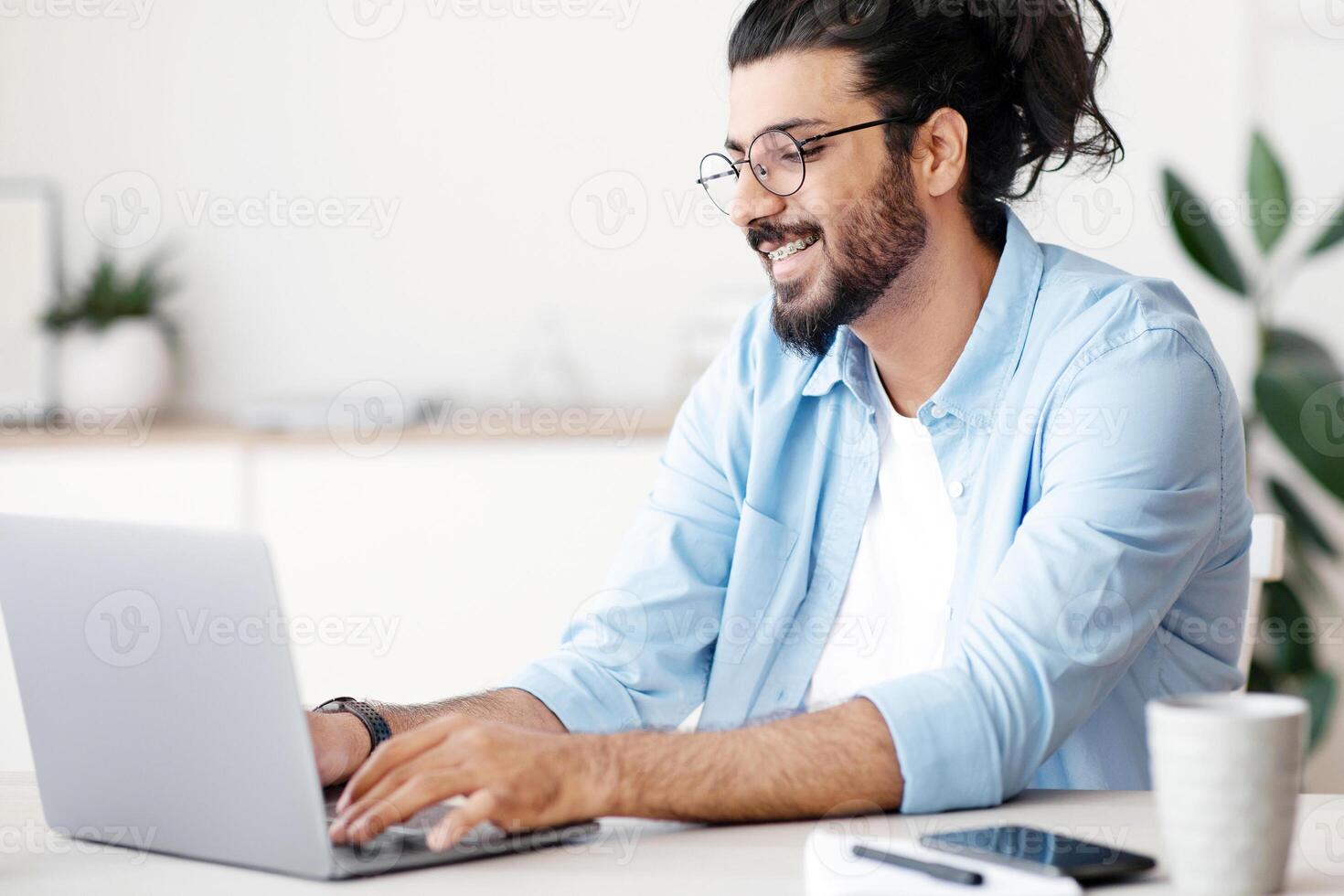 Smiling western freelancer guy working on laptop at home office, sitting at desk using computer, young indian man in eyeglasses typing on keyboard, looking at screen, enjoying remote work, copy space Pro Photo