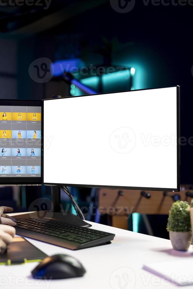 Photographer using advanced photo editing software on isolated screen monitor to make improvement to images quality. Photo editor utilizing specialized photographs retouching application on mockup PC Pro Photo