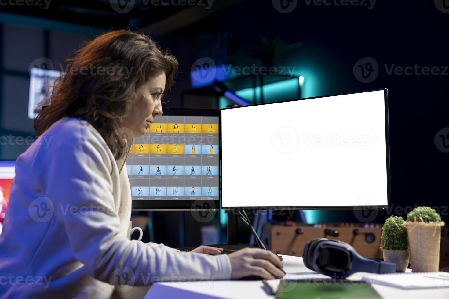 Photographer enhancing images quality using isolated screen display, correcting flaws and adjusting contrast. Photo editor using retouching software on mockup PC to edit photographs Pro Photo