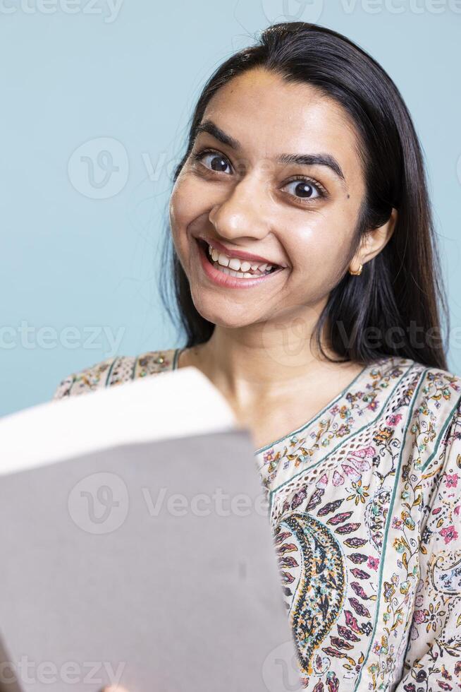 Happy joyful person reading captivating book and enjoying lecture hobby, being entertained against studio background. Indian relaxed person with intriguing novel in arms enjoys free time. Pro Photo