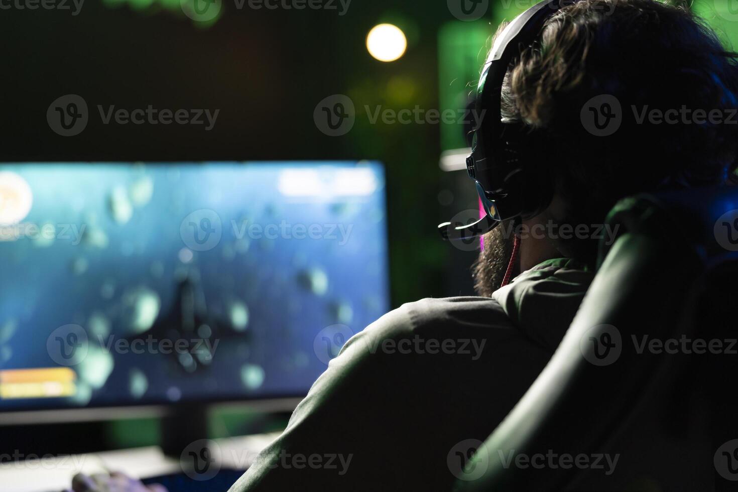 Gamer using headset and computer to play spaceship flying singleplayer game with overlay HUD showing health, fuel, ammo bars and minimap. Man playing space exploration simulation game, wearing headset Pro Photo