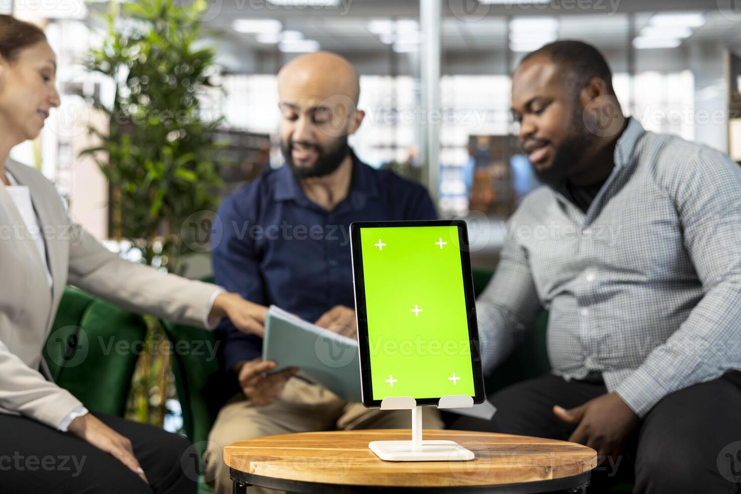 Isolated screen tablet next to workers looking over research documentation needed for finding business insights and finishing project task. Employees analyze data on mockup device and paperwork files Pro Photo