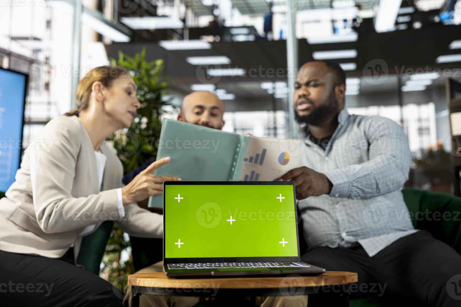 Green screen laptop in front of employees checking progress done on customer commissioned project. Chroma key notebook next to office clerks reading data statistics on paperwork after business audit Pro Photo