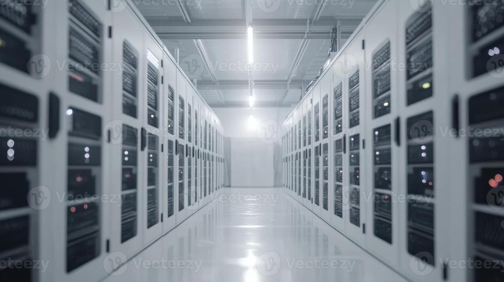 Vast modern data center with illuminated server racks in a symmetrical arrangement and shiny white floors highlighting technology advancements. Infrastructure crypto mining Pro Photo