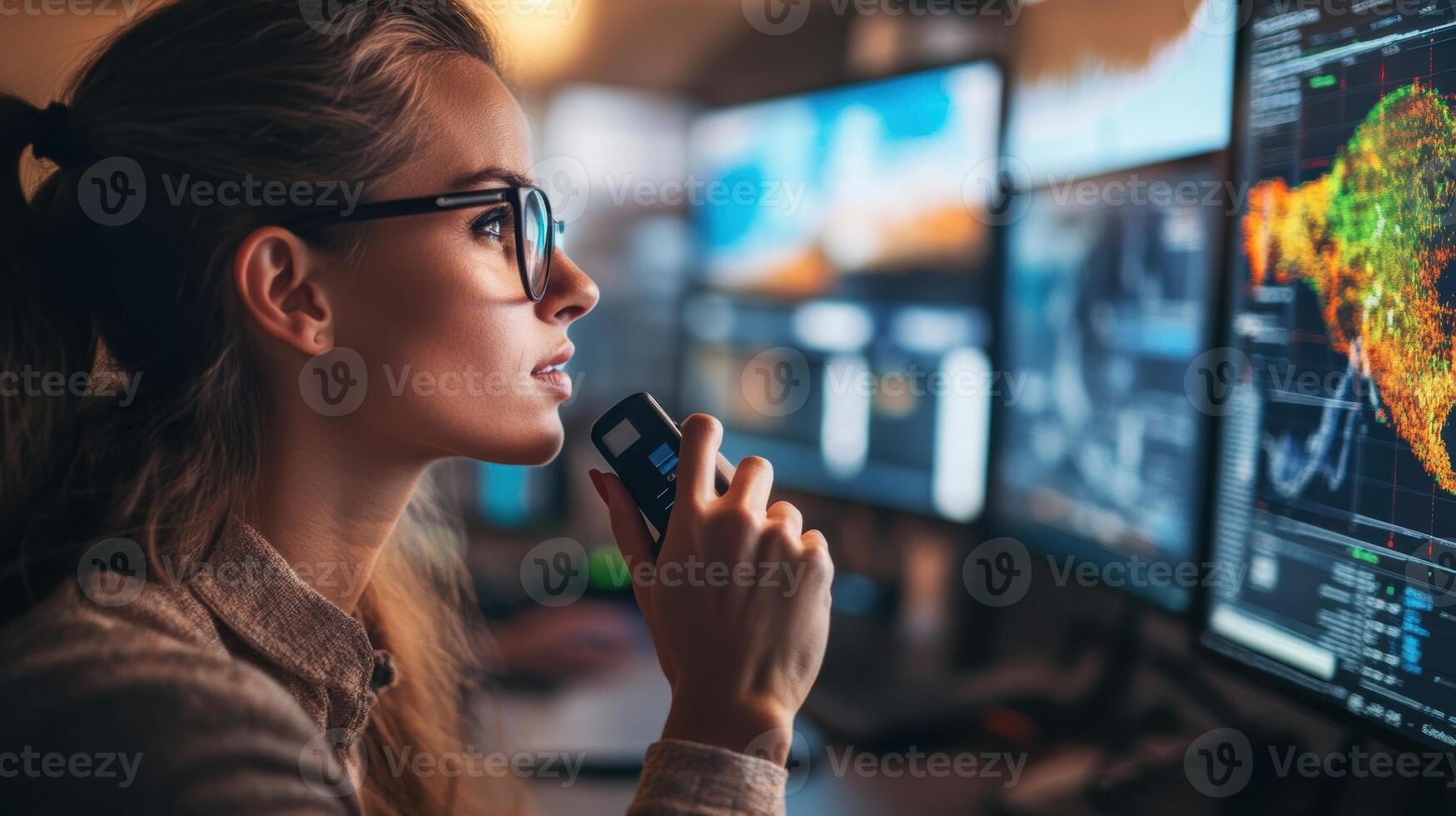 Focused young caucasian female data analyst managing complex information systems on multiple monitors in technology-driven environment. Weather service office Pro Photo