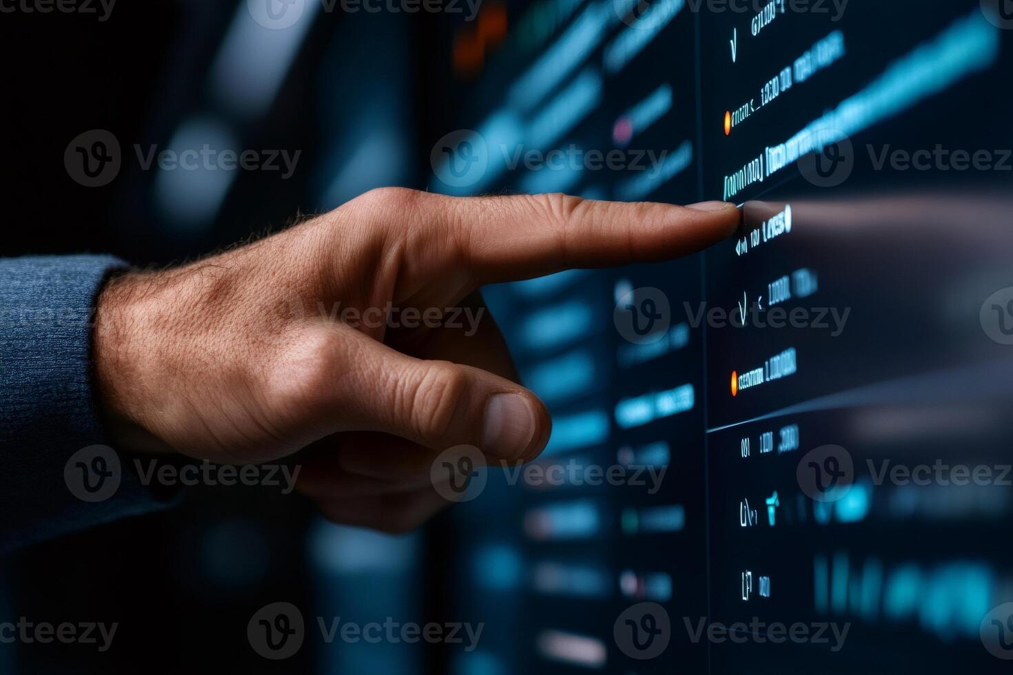 Software engineer pointing at computer screen showing lines of code Pro Photo