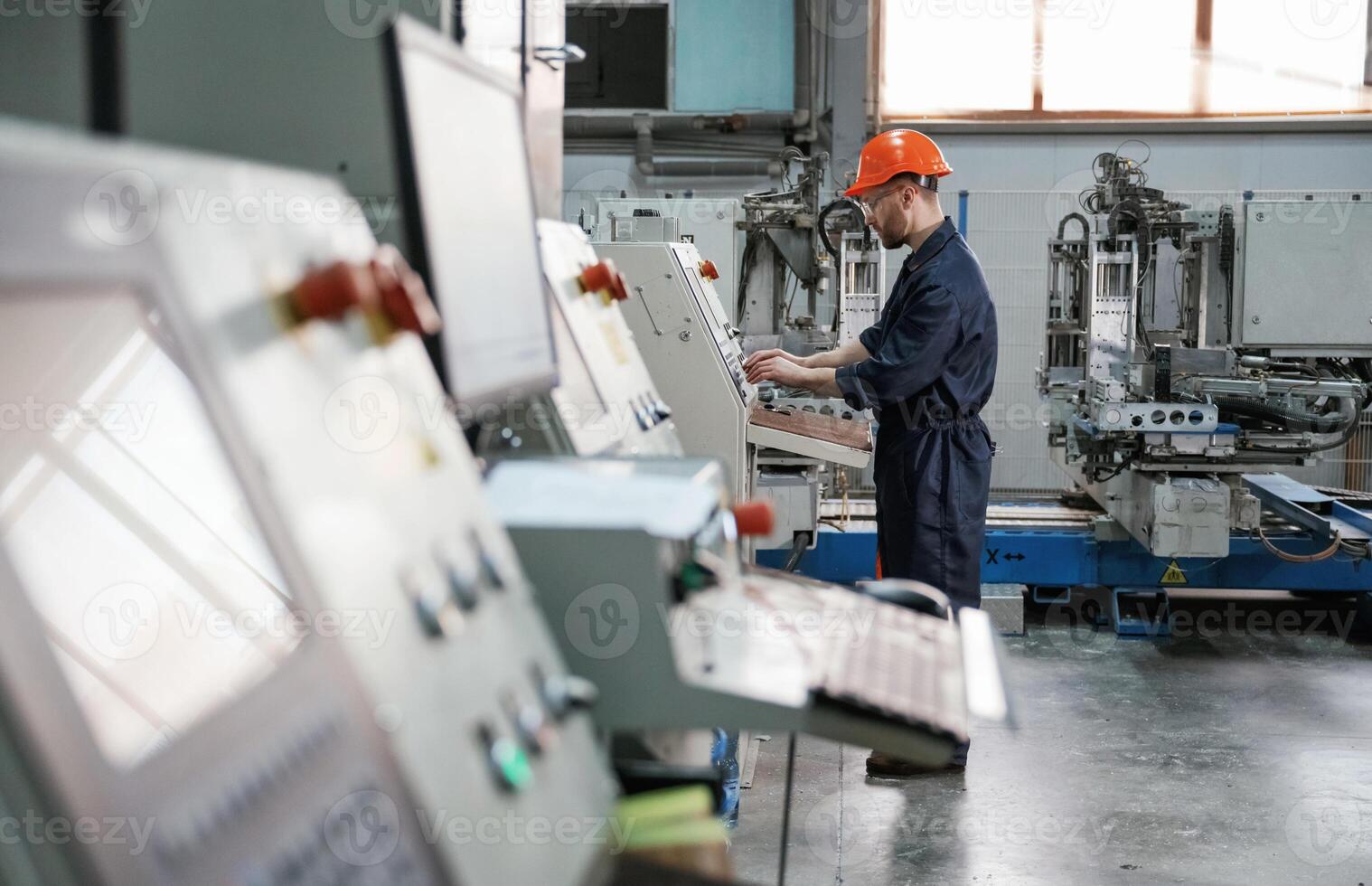 View from ,the side, working with machine, operator. Factory worker is indoors with hard hat Pro Photo