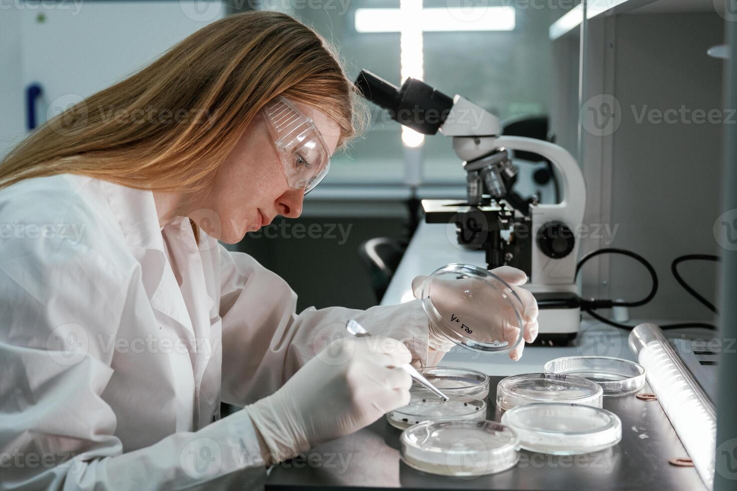 With, microscope. Woman is working with Sclerotinia that is in the rounded containers in the laboratory Pro Photo