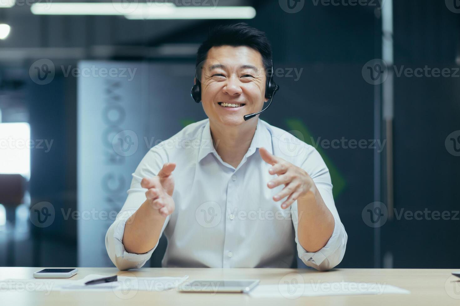 Asian man with headset talking on call, looking into web camera, smiling cheerfully and gesticulating with hands, tech support Pro Photo
