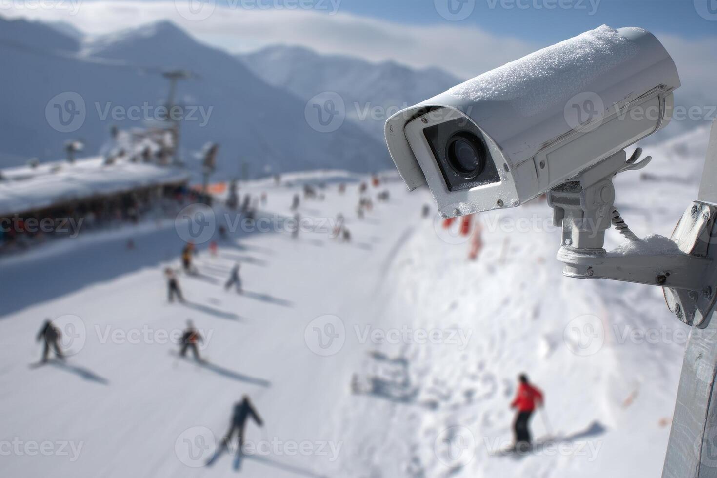Security camera covered in snow overlooks a busy ski slope with various skiers enjoying a snowy day. Blurred background features snowy mountains under an overcast sky Pro Photo