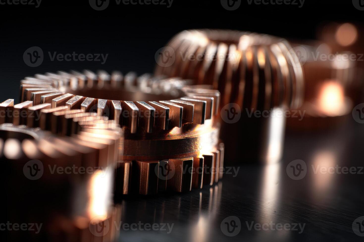 Copper gear-like objects arranged in a row on a reflective surface, displaying intricate teeth and grooves, with a focused lighting effect creating depth and highlights Pro Photo