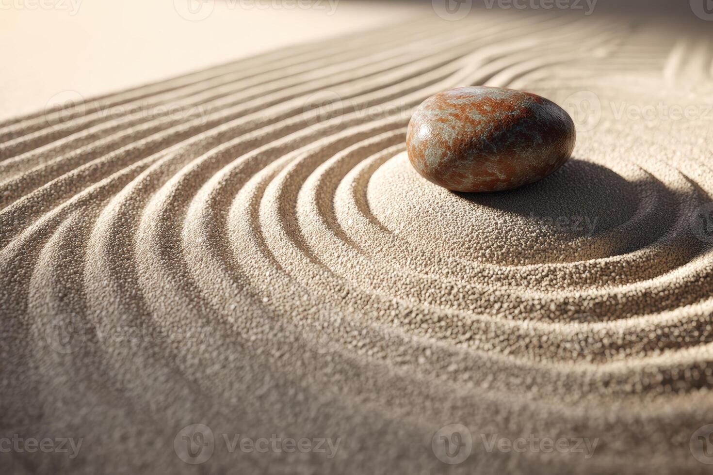 Smooth stone rests on finely raked sand creating harmonious patterns of concentric circles, evoking a sense of tranquility and balance, with light casting gentle shadows Pro Photo