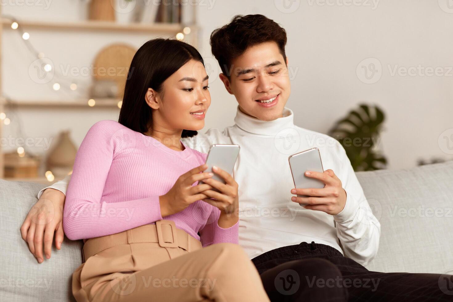 Asian Couple Using Smartphone Phones Browsing Internet Sitting Together On Sofa At Home. Spouses Using Social Media Networking And Texting Online. Mobile Application For Cellphone Concept Pro Photo