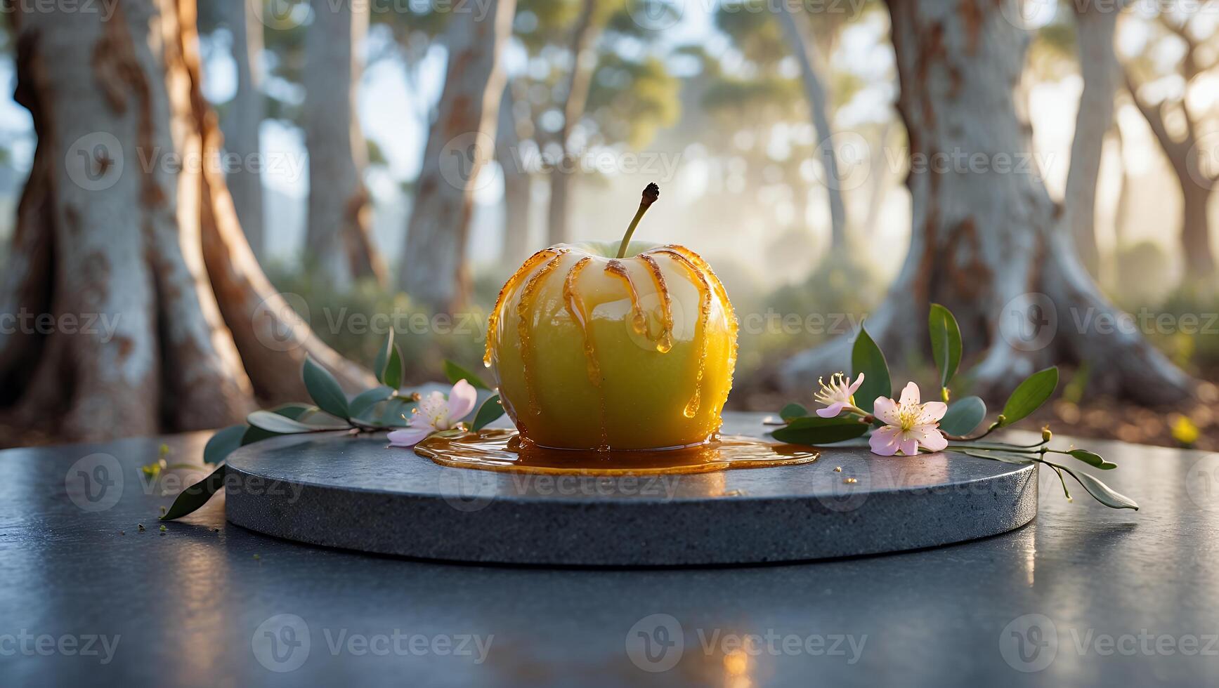 Green Apple with Drizzle on Round Surface in Forest Setting Pro Photo