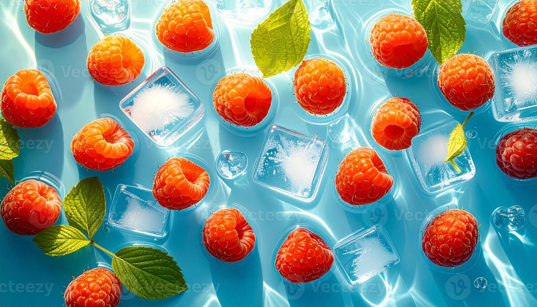 holizontal background floating ice and raspberry in water with refreshing summer concept Pro Photo