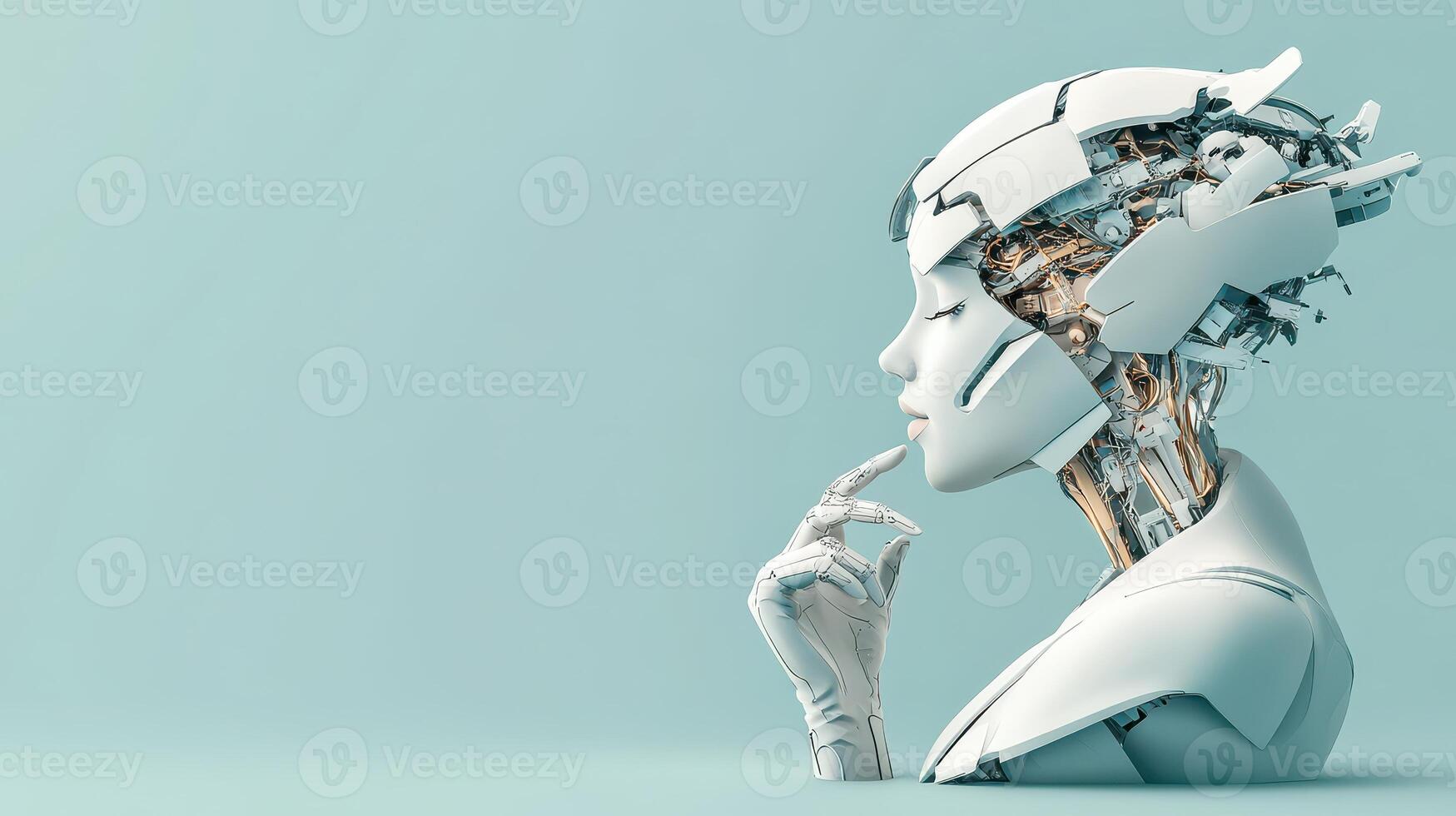 Artificial Intelligence Robot Profile Thinking with Finger Near Lips on Light Blue Background. Brain Electronic System inside Humanoid Head using Neural Networks Pro Photo