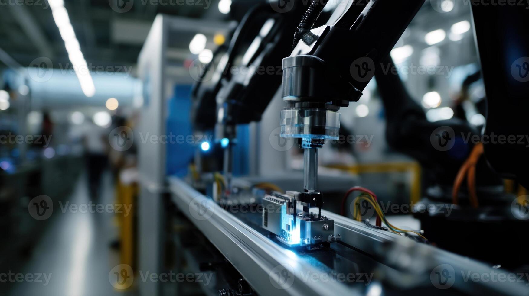 A closeup view of a microfactory filled with robotic arms and sensors highlighting the seamless integration of edge computing technology for realtime processing Pro Photo