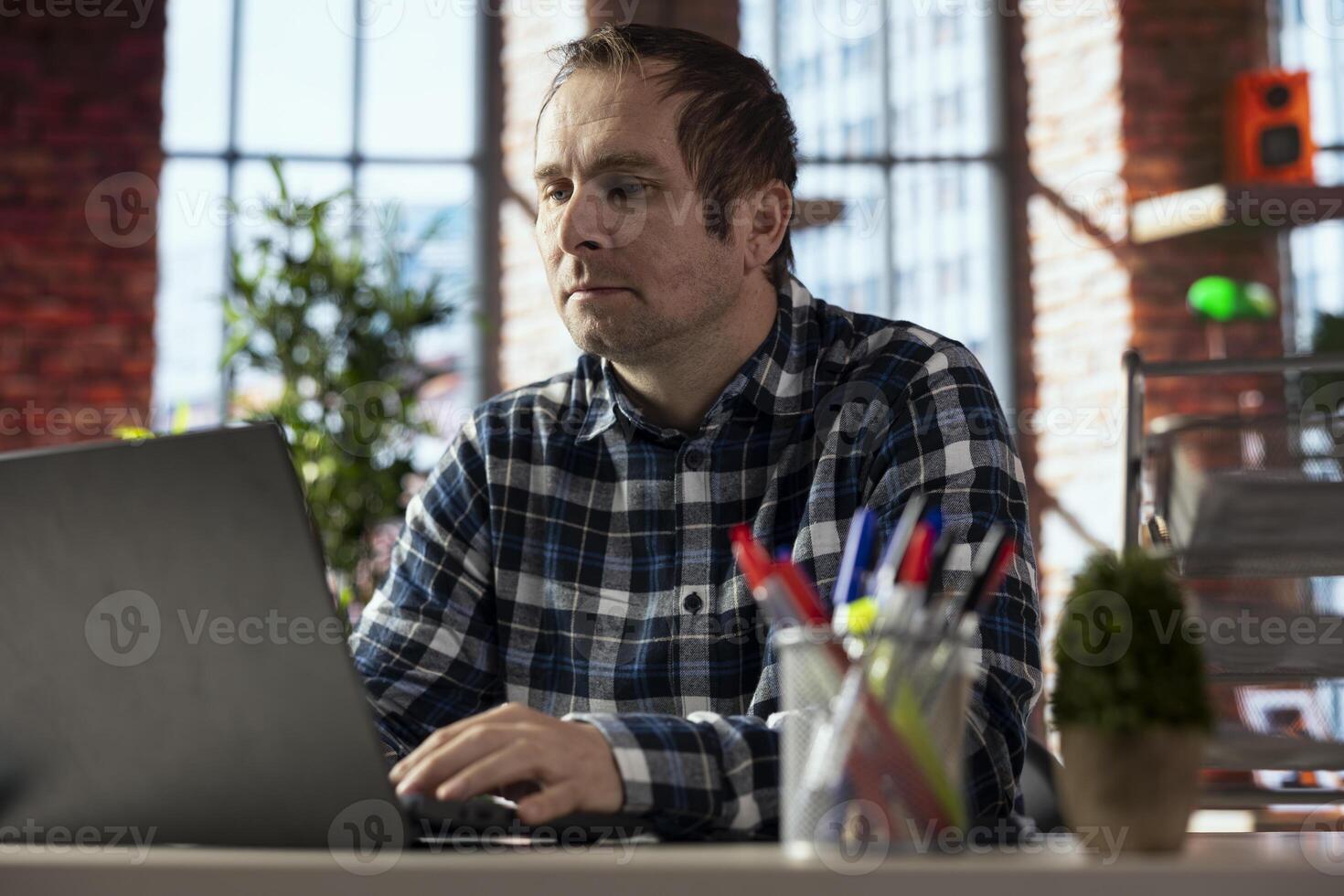 Freelancer in home office using laptop, checking emails displayed on screen, reading messages in inbox. Teleworker in apartment workspace managing electronic correspondence on notebook Pro Photo